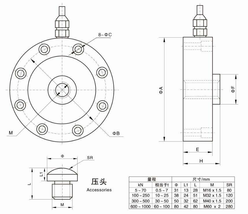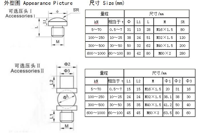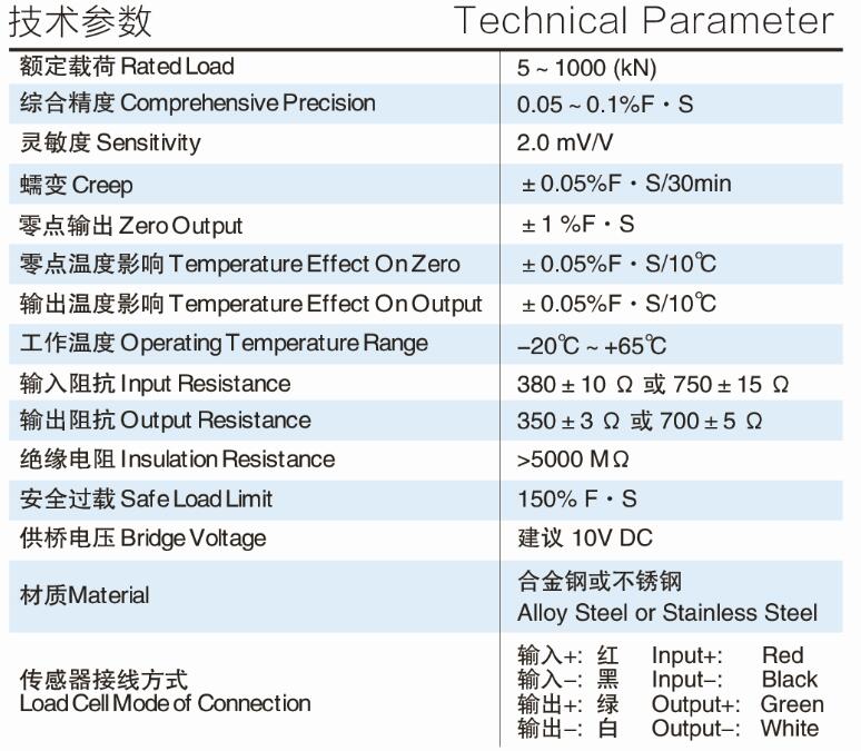 量程 5,10,20,30,50,100,200,300,500,600,1000(kN) 高度低,钢性好,精度高,抗偏载能力强。广泛应用于皮带秤、料斗秤、 料罐 、材料力学试验机、劳保安全检测设备