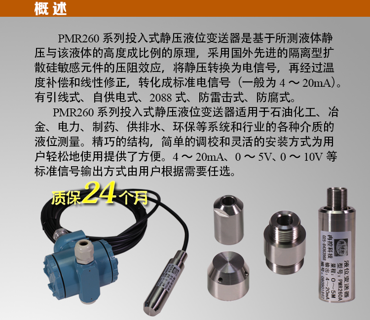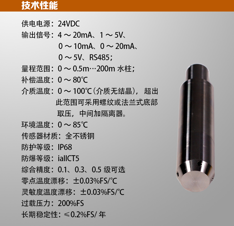 测量范围:0.3~100米(由用户自选); 工作温度:-20~80℃ 灵敏区:1.0%FS; 负载能力:0-600 相对温度:85%; 直接投入到介质内部测量液位、采用高性能离子硅压阻式传感器;